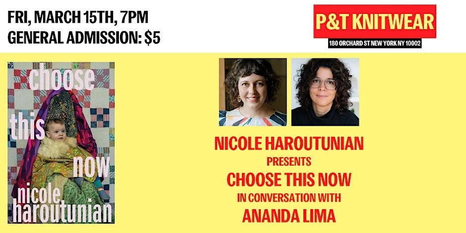 Join me and the incredible Ananda Lima (Craft: Stories I Wrote for the Devil and Mother/land) at P&T Knitwear to celebrate the launch of Choose This Now! Reserve your tickets—$5 goes toward a purchase of the book or a drink!